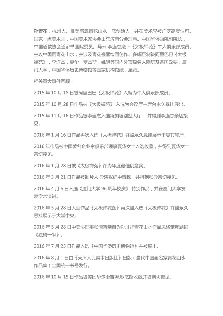 喜讯 | 2021VAL跨年嘉年华慈善拍卖,著名画家孙才祥(孙青花)先生一平尺作品《上善若水》以25000元现场成交。孙青花(孙才祥),杭州人。唯美写意青花山水一派创始人,并在美术界被广泛高度认可。国家一级美术师,中国美术家协会山东济南分会理事。中国华侨画院副院长,中国道教协会道家书画院委员。马云.李连杰麾下《太极禅苑》牛人俱乐部成员。主攻中国画青花山水,并涉及青花瓷器绘画创作。多幅巨制被阿里巴巴《太极禅苑》,李连杰,夏华,罗杰斯,姚明等国内外顶级名人圈层及各国政要,厦门大学,中国华侨历史博物馆等国家机构